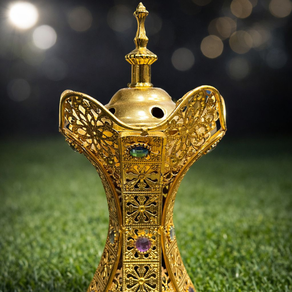 Royal Amber Bakhoor Daan is crafted for those who appreciate timeless luxury and rich tradition. Its golden finish reflects warmth and royalty, making it a beautiful centerpiece for any space. Designed to gently release the aroma of bakhoor, it fills your surroundings with a calming and luxurious fragrance.